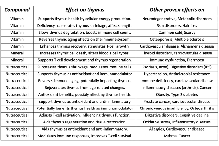 Minerals (e.g., Mineral 1, Mineral 2) aid T-cell development and thymus regeneration.